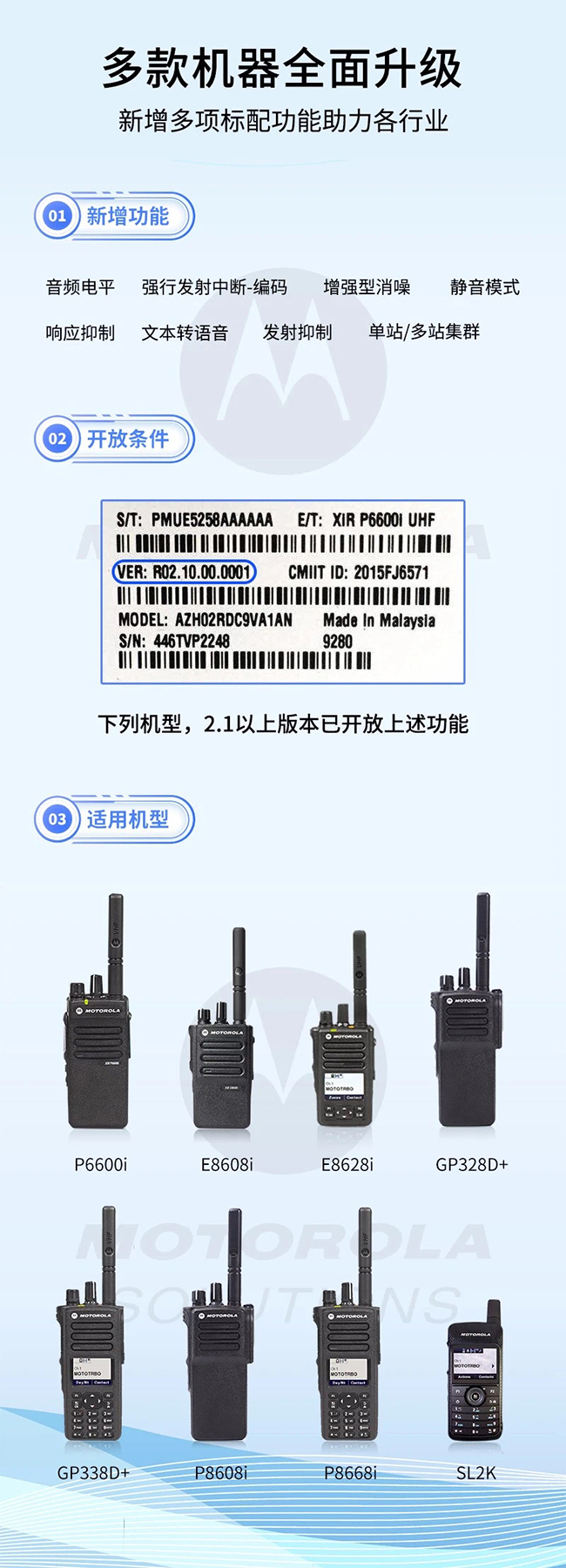 從2019年第四季度開始,我司經(jīng)銷的多款摩托羅拉對講機(jī)新版機(jī)器在出廠時,有些功能已經(jīng)免費(fèi)開通供客戶使用了,其中包括:音頻電平、強(qiáng)行發(fā)射中斷-編碼、增強(qiáng)型消噪、靜音模式、文本轉(zhuǎn)語音、發(fā)射抑制、響應(yīng)抑制和單站/多站集群。