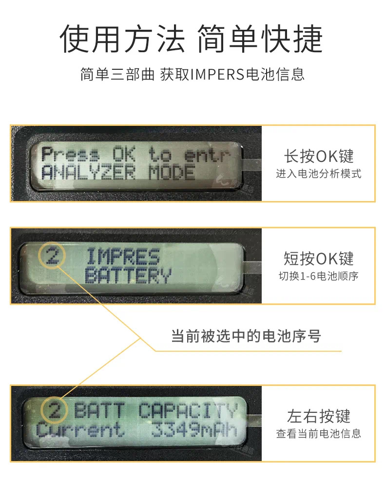 2代IMPRES智能六聯(lián)充,突破1代顯示屏只能查看第1個充電插槽中IMPRES電池信息,增設切換按鍵,無需反復插拔電池,便可獲取6個充電插槽中任意1個IMPRES電池的相關信息。